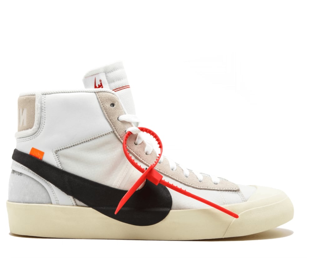 "An iconic hoops profile is elevated and reworked by Virgil Abloh, creating a stripped back iteration of the Blazer Mid. Teaming up with Nike to release a limited collection of re-imagined classics, Abloh explores 10 icons from the Swoosh’s extensive archive. The Ten : Nike Blazer Mid X Virgil Abloh sees the basketball shoe cut and sewn - designed to look accessible: hand-made, open-source and reconstructed as part of the “REVEALING” theme.