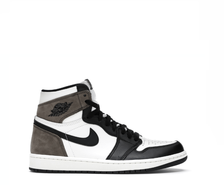 "The Air Jordan 1 High "Dark Mocha" features a white leather upper with black overlays across the forefoot and brown on the heel – a color combination that has drawn comparison to Travis Scott’s reverse-Swoosh AJ1 collaboration. The sneaker is branded with a black Swoosh on the side, black Wings logo at the collar, and a grey Jumpman logo on the tongue. Underfoot, sole units opt-out of the brown tone in favor of an off-white midsole, “Black” outsole combination.."